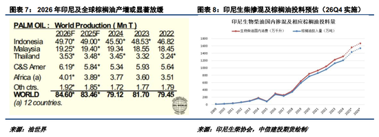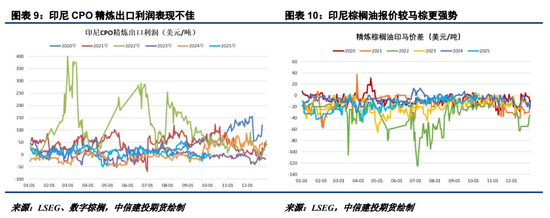 而在印尼政府下决心推进B50的过程中,棕榈油投料需求大幅增长也可能令国有企业Agrinas将重心放在满足国内需求而非出口上,这或导致海外市场棕榈油供应收缩更为明显。随着B50完成实验室测试并进入第四轮测试,且国有企业在积极新建生物柴油产能,印尼政府正向B50计划不断迈进,2026年下半年实施B50已被纳入规划。根据印尼能矿部预估,全年实施B50将需约2010万千升PME掺混需求,相较于B40的1560万千升大幅增长,将对应300多万吨棕榈油需求增量。尽管B50可能要到明年3-4季度才有可能实施,对应的2026年棕榈油投料需求增量可能仅百来万吨,该需求增幅仍可能超过产量增幅,令印棕的供需呈现明显收缩倾向。