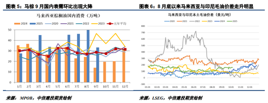 从9月数据来看,我们认为走私的猜测更具解释力,因欧盟POME进口及马来油脂化工需求难有如此之大的单月波动。更可能得情形是,8月底以来马来西亚与印尼毛油价差走升至150美元/吨上方,令走私活动再度变得活跃,这再度挤占了马棕国内表观需求。不过,在未来印尼面临更大供需矛盾的预期下,我们预计马来西亚与印尼毛油价差难以长期维持高位,马棕国内表观需求仍将趋于走升,将有利于后期马棕库存去化。